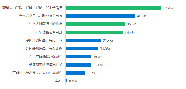 巨量算数&36氪研究院调研数据显示,消费者对于食品饮料产品健康相关要素的关注度较高,排名前四的消费者关注要素中,有三条与健康相关。57.4%的消费者表示会在选购食品饮料产品时关注配料表中的低脂、低糖、低钠、低卡等信息。